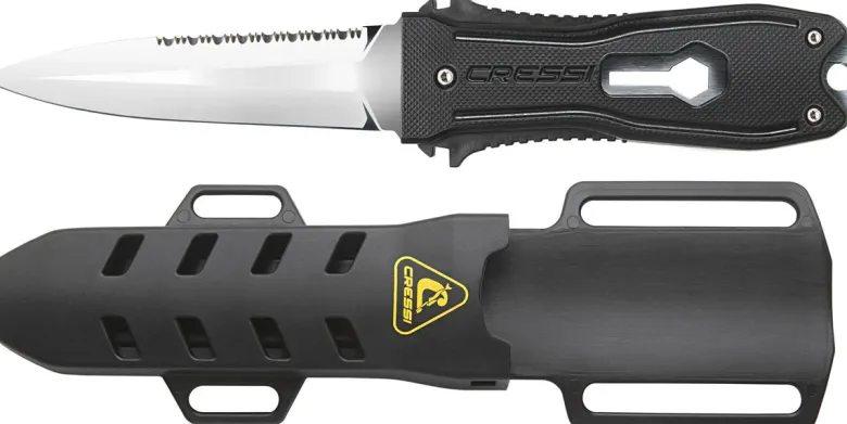 Italian-made professional, multipurpose diver’s knife, with blade and handle in w 1.4116 martensitic stainless steel, hardness HRC 55/56, for an extremely sharp and honed blade. The 1.4116 steel is a stainless steel known for its high corrosion resistance, strength, and good mechanical properties. A knife with a dagger handle designed specifically for fishing. In the body of the knife, a part is intended for the extraction of stranded shafts and for straightening them. The knife can be removed from its sheath quickly and with one hand thanks to a special mechanical system.