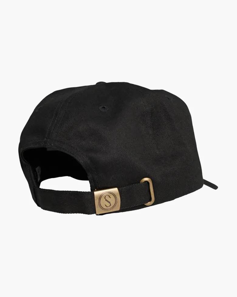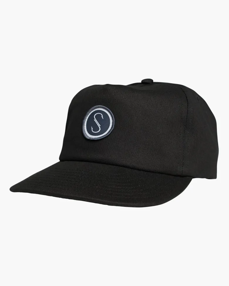 The S Hook 5 Panel Unstructured Cap in Coal is an unstructured cap with mid-crown height and a woven damask patch