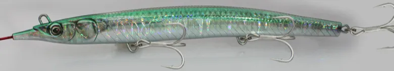 The Little Jack Sayoris 182mm sinking pencil bait is an amazingly real looking Garfish imitation bait. The new 54g model has been hugely popular for casting angling everywhere. Whether from the rocks or from a casting deck on a boat these lures have accounted for Australian fish that feed on gar. With a wire through construction these lures will handle the hard Australian fishing conditions.