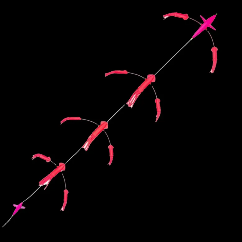 The Hookem Surface Teaser creates commotion in the water to attract a variety of pelagic species, particularily tuna and marlin. These teasers feature rubber squid and bird attractors, proven to entice game fishing species. Each design features 3 large squid, 6 smaller squid and 2 birds (small and large). Full length: 180cm