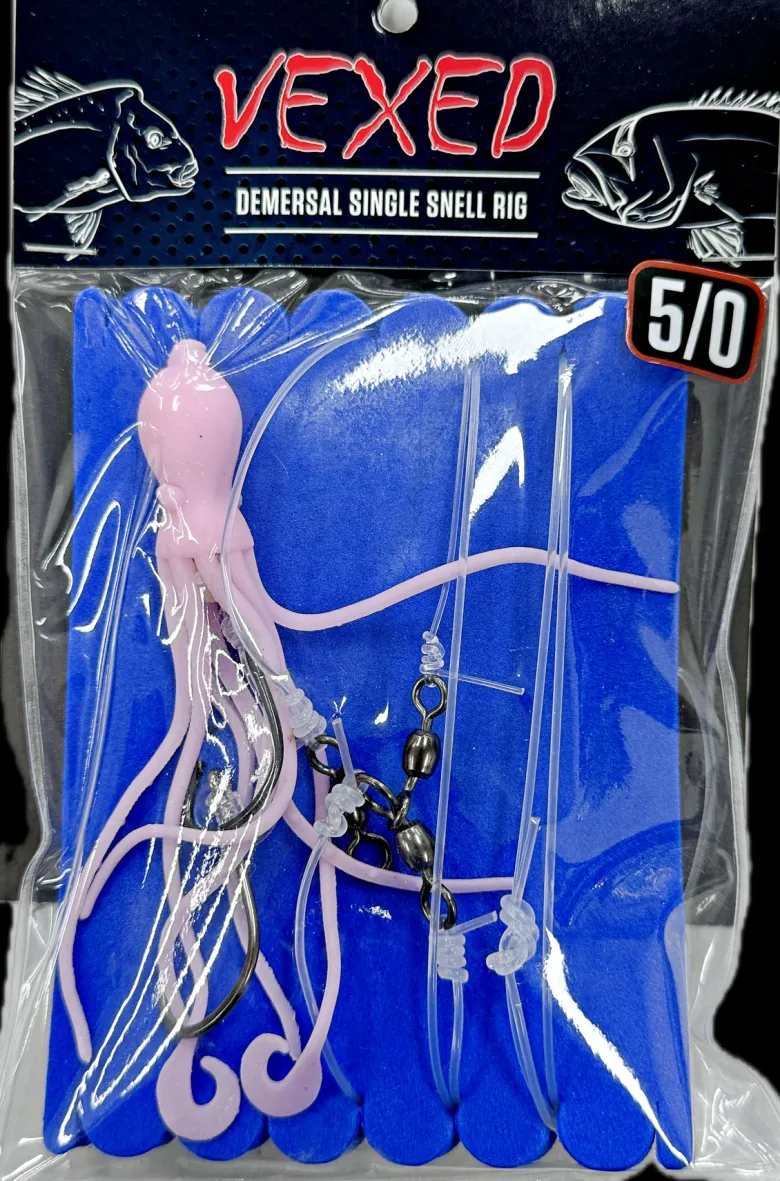 This is a simple old school rig for the traditional Bottom Bashers who haven’t discovered the HUGE Benefits of the Vexed Bottom Meat. This Single Snell Demersal rig consists of 1 snelled hook set on super durable 100lb leader.