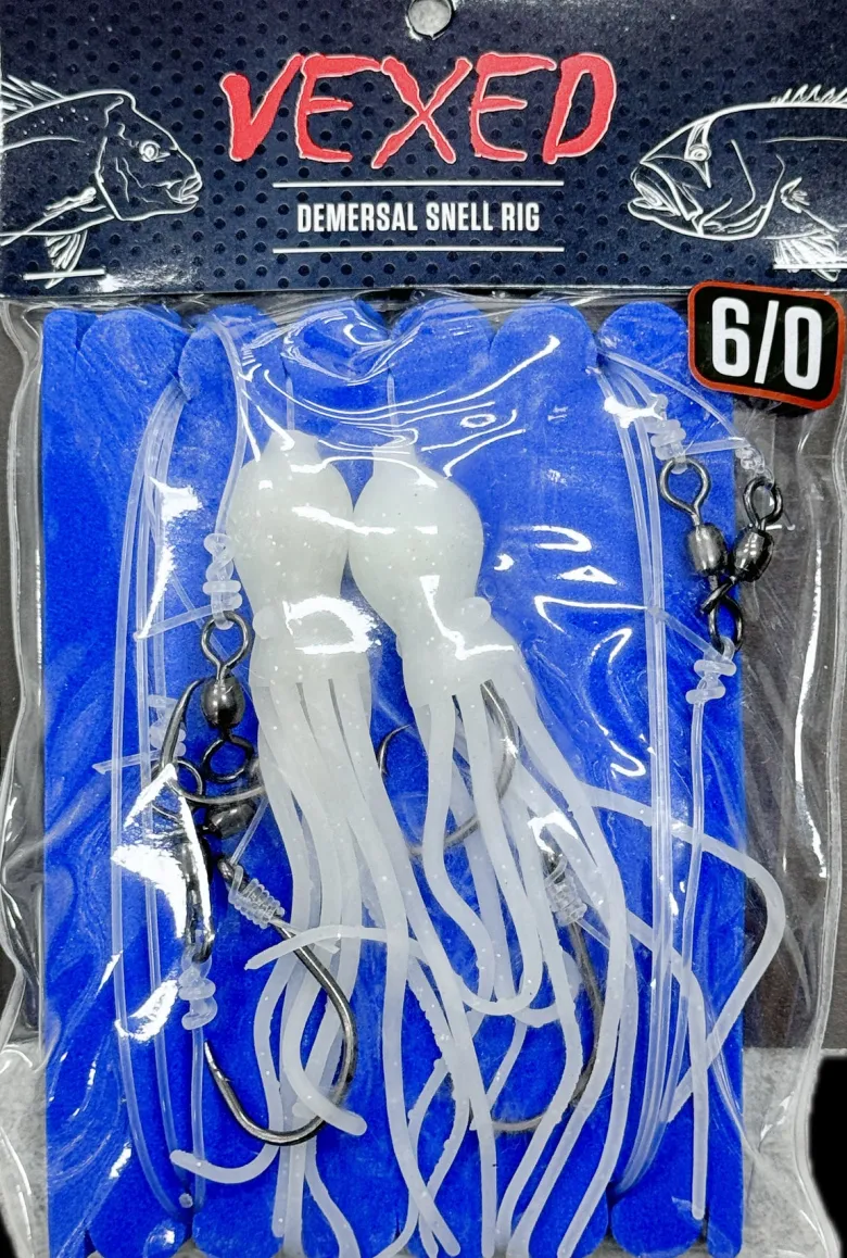 This is a simple old school rig for the traditional Bottom Bashers who haven’t discovered the HUGE Benefits of the Vexed Bottom Meat. This Double Snell Demersal rig consists of 2 snelled hook sets on super durable 100lb leader. Do yourself a favour and tie a 150g-350gm Vexed Bottom Meat on the bottom as a fish catching sinker to maximise results.
