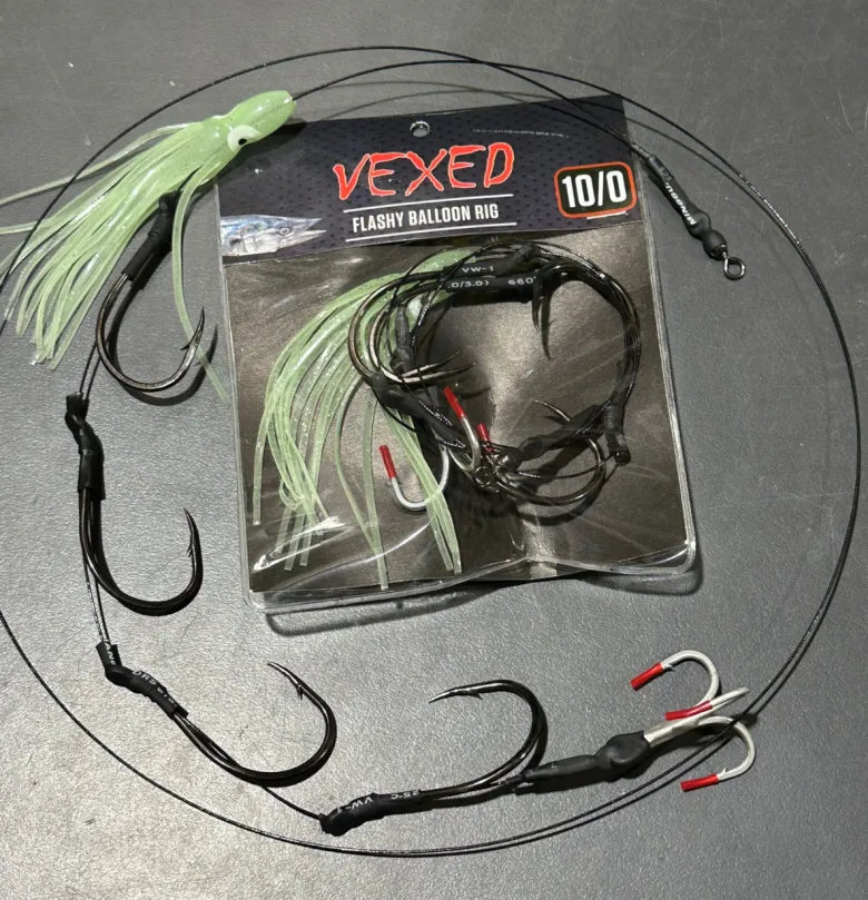 The Vexed Flashy Balloon Rig is the first of its kind to hit the market in Australia. 25 years of gas ballooning experience has meant we have perfected this rig. We understand the importance of thin gauged strong hooks for maximum penetration on hard toothy mouthed predators such as spanish mackerel. The Vexed Flashy Balloon Rig comes in 8/0 for southern garfish and pike baits, and a bigger 10/0 version for northern broad back garfish/ballyhoo and mullet baits. We have added just enough flashy UV tail under the 19cm squid skirt to attract fish from afar.