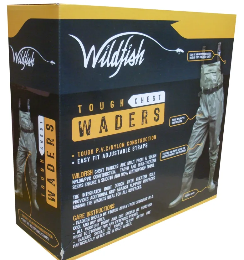 Wildfish Chest Waders are built from a tough Nylon/PVC construction. Taped and heat treated seams ensure a smooth and 100% waterproof finish. Adjustable, quick release clips allow you to tailor the fit of the waders while still ensuring enough space for additional clothing and unrestricted movement. The integrated boot design with cleated sole provides additional grip against slippery surfaces making the waders ideal for all surfaces.