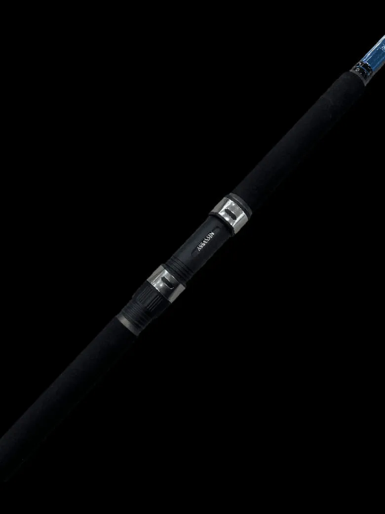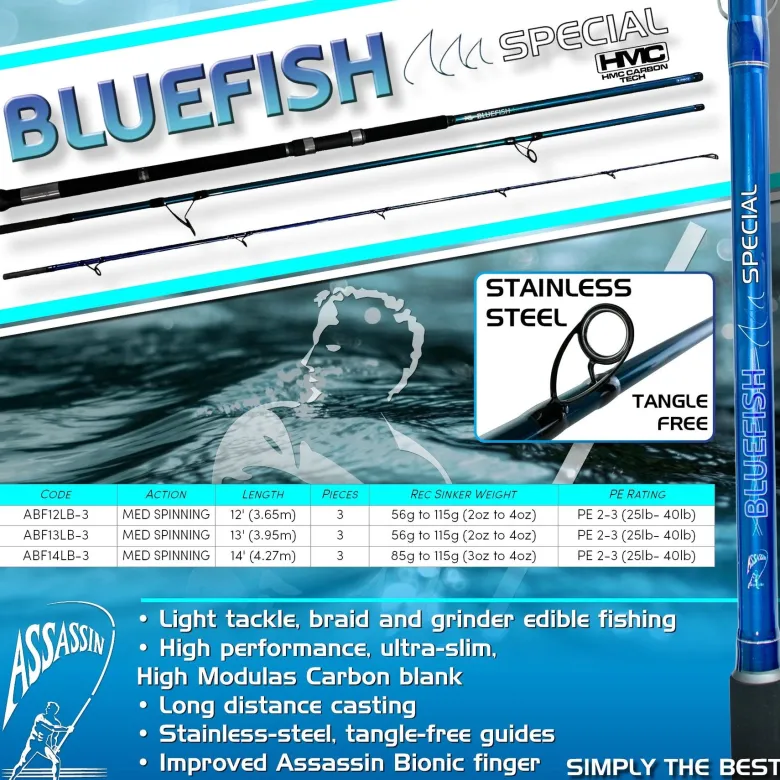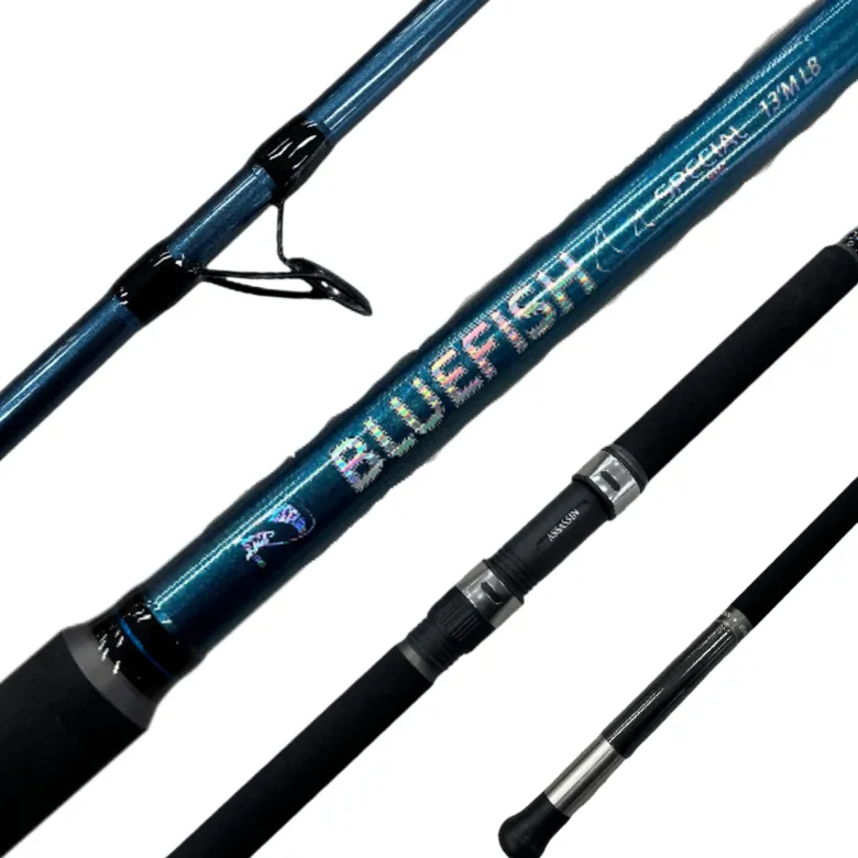 BLUEFISH • Light tackle, braid and grinder edible fishing • High performance, ultra-slim, High Modulas Carbon blank • Long distance casting • Stainless-steel, tangle-free guides • Improved Assassin Bionic finger