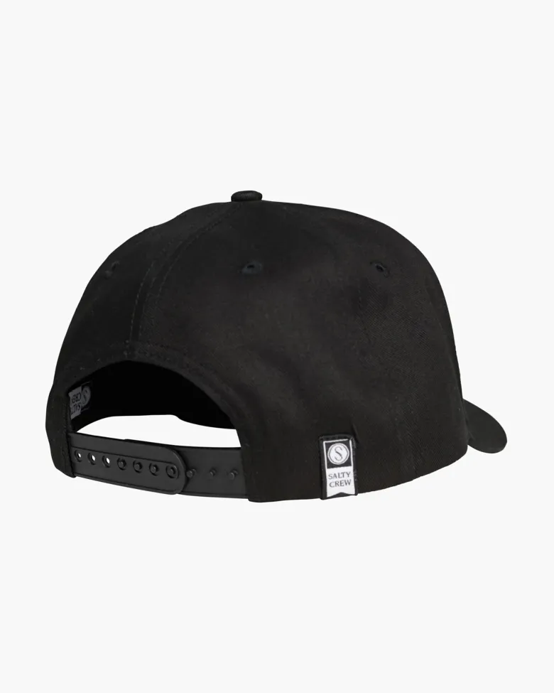 The Angler 6 Panel Cap in Black is a structured 6 panel cap with mid crown and plastic snapback