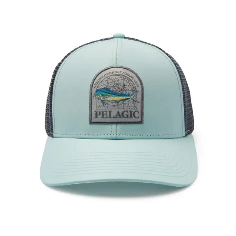 Trucker hat featuring a front embroidered patchCustom game fish logo side embroideryVented mesh back panelsAdjustablesna…