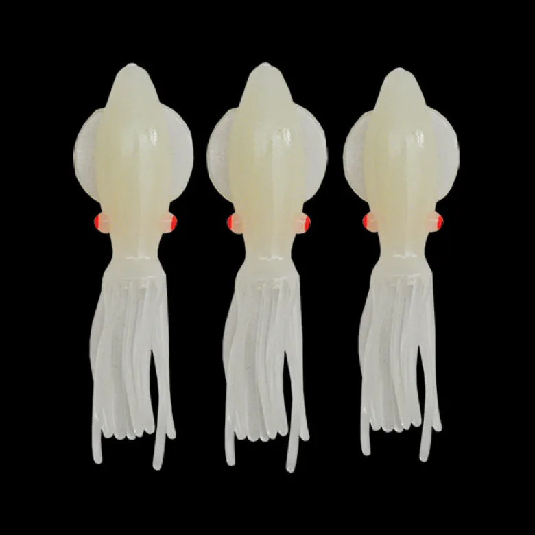 The SW Lab Lumo Bottle Squid feature a Hi-Glow Luminous Body that glow ultra bright. Ideal for adding to bottom fishing rigs for extra attraction.They feature super bright eyes are 4″ long and come with 3 pcs per packet.