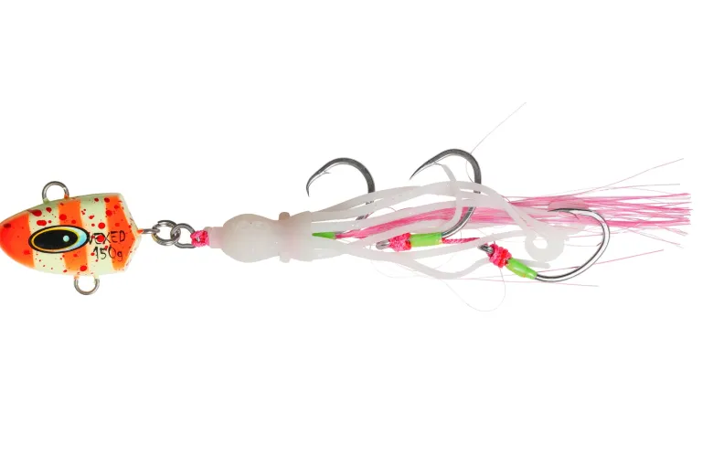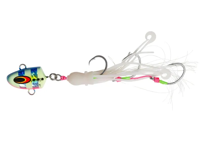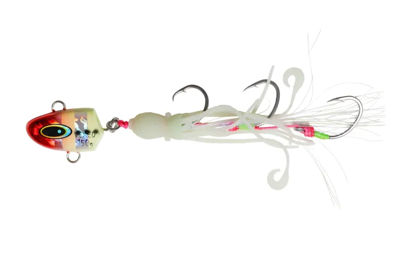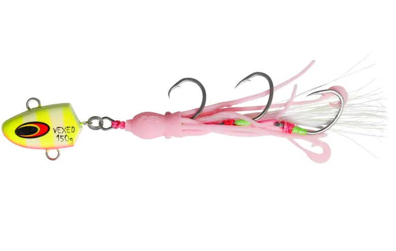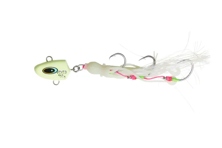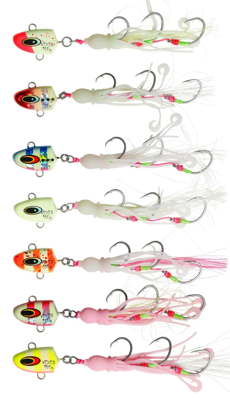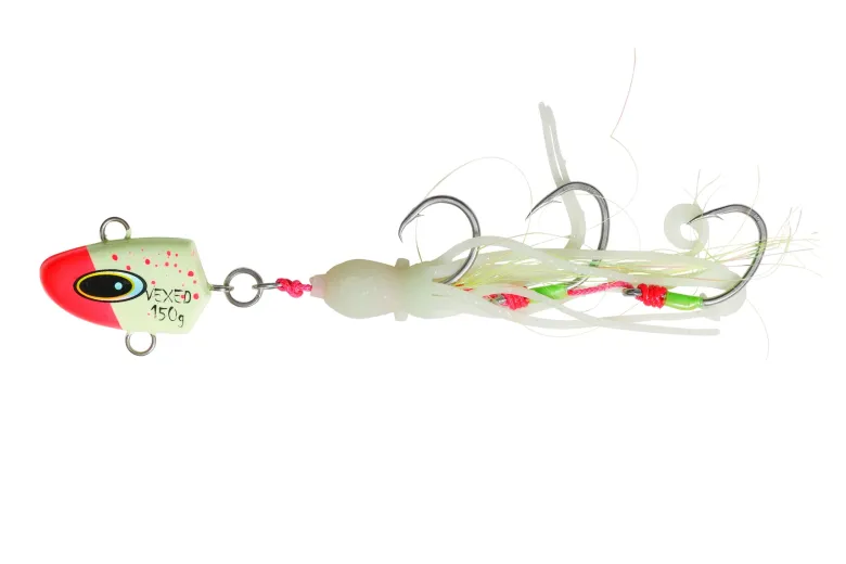 This “Thang” has been specifically designed to descend filthy big baits to the bottom with a high intensity glowing Vexed DHU BOMB head to attract the maximum amount of fish. This has so much more appeal than a conventional sinker rig and will catch more fish.Vexed Bottom Meat is fitted with a “Harbor Triple Murder Assist” rig which will wrap around the face of any fish that dares to eat it. For an extra bit or irresistible flashy appearance, add a harbor flashy occy head assist hook skirt and you will have an extremely attractive, smelly protein packed artificial offering. You can use any bait you like on this style of rig, we have found that fillet baits work great as do large squid and octopus tentacles. One tip we will give you is to make sure you use “Bait Buddy” cotton thread to secure the heads to the “Triple Murder Assist” so your baits last longer.